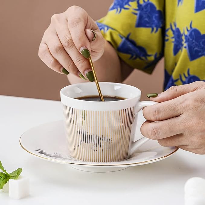 When the cup is placed on its matching saucer, the pattern painted on the saucer is reflected onto the mirrored surface of the mug.